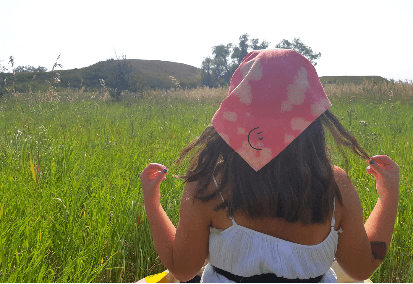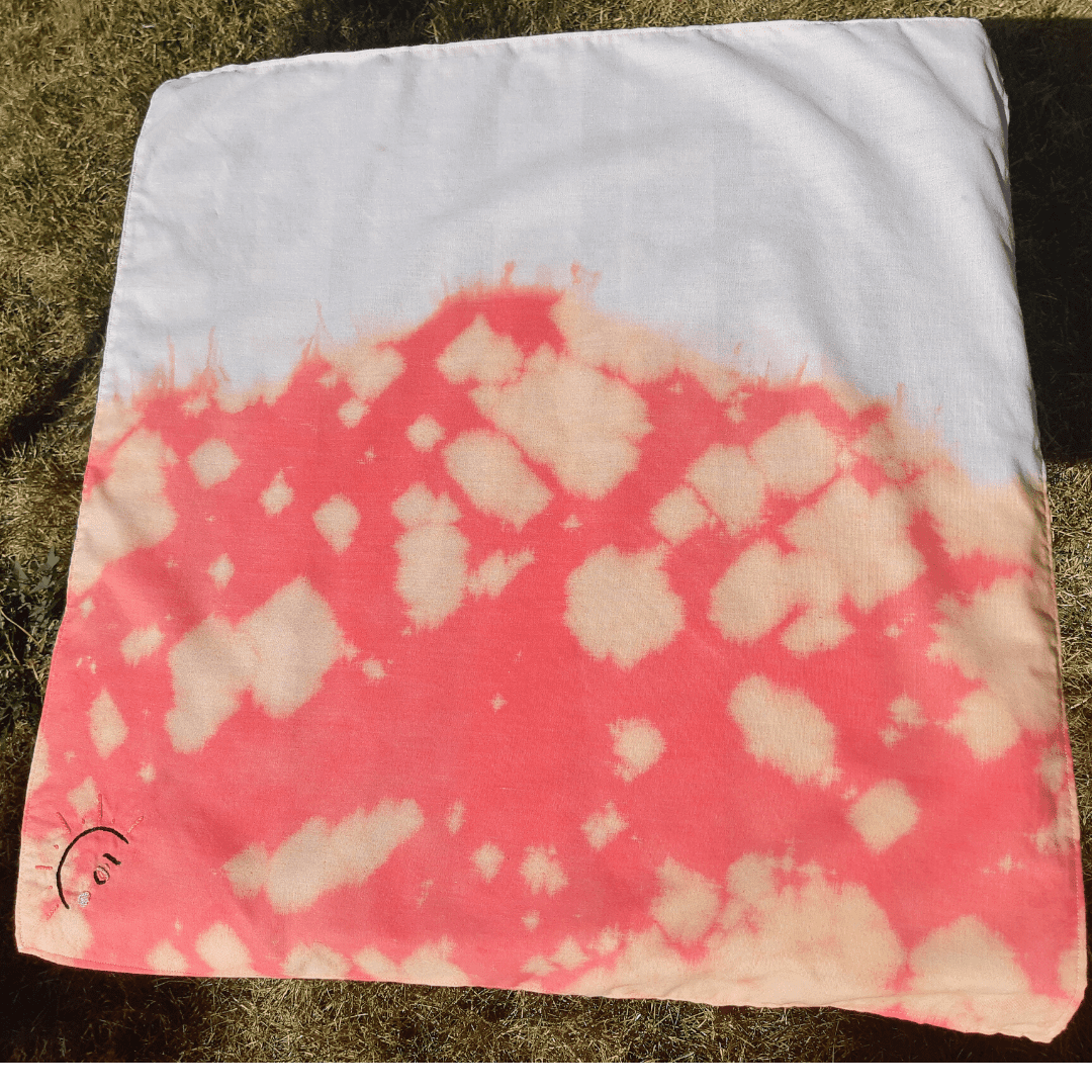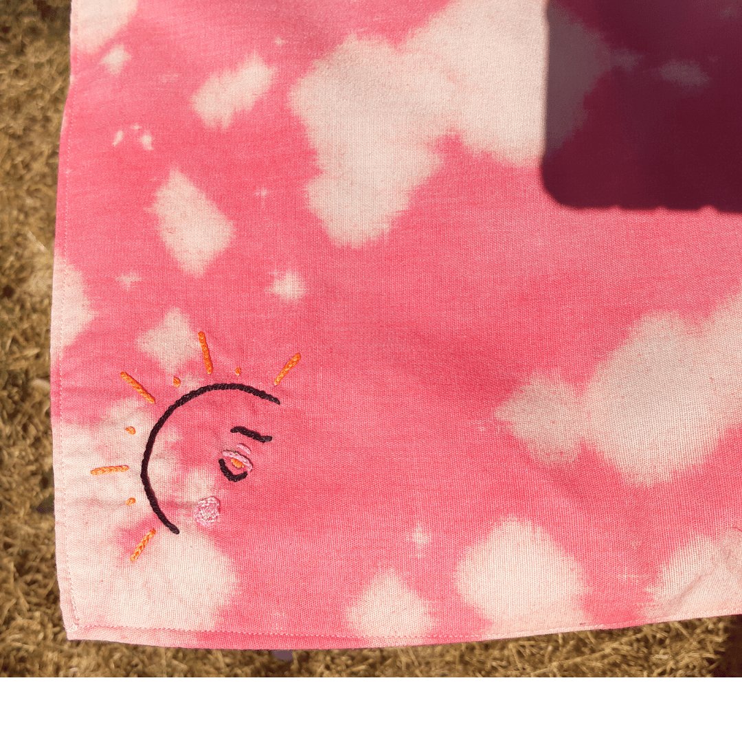 Hand dyed and bleached bandanna, roughly 24″ x 24″, featuring a hand embroidered design of a crying sun.