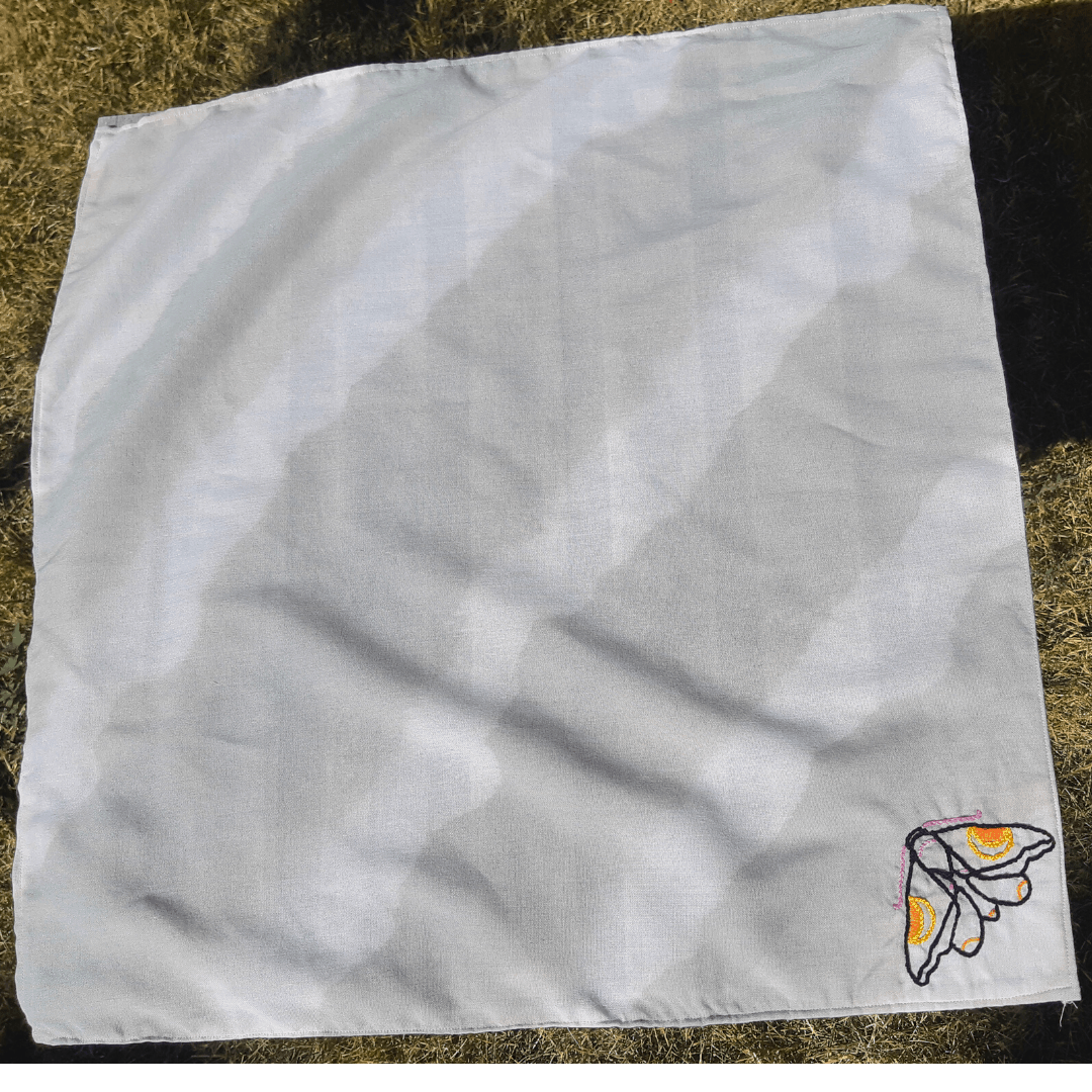 Hand dyed and bleached bandanna, roughly 24″ x 24″, featuring a hand embroidered design of a moth.