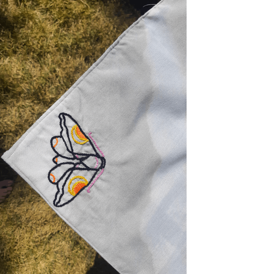 All embroidery is secured with lightweight interfacing, meaning it can be gently machine washed and dried on low. Expect slight variations in the patterns of the bleach spots.
